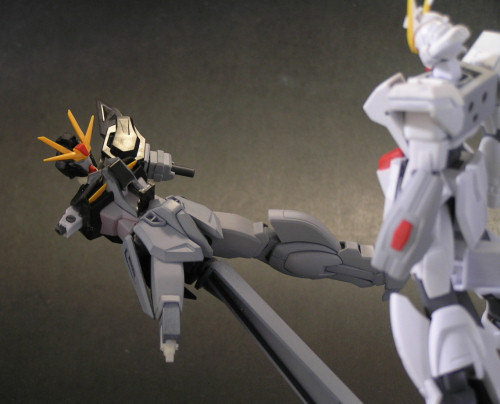 ■ STAGE3にて、大破したストライクノワールと邂逅するシーンを再現してみました。コクピットは展開状態で固定しています。