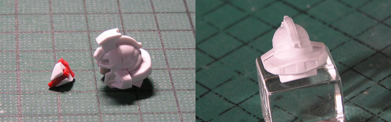 ■ 基本的な工作ですが、フェイス部の後ハメ工作を施しました。またスターゲイザー製作でおなじみの、トサカの幅増し工作と後頭部カメラの作り直しを行っています。