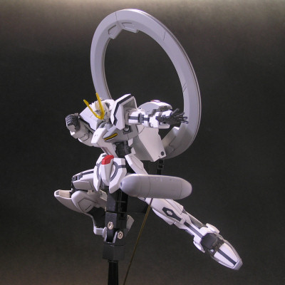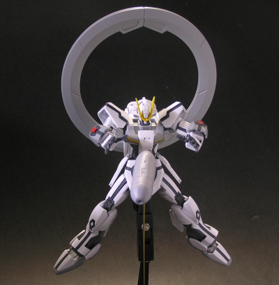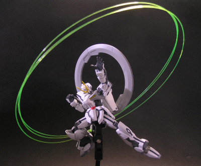 ■ PS2用ソフト 連合 VS Z.A.F.T. 2 PLUSで見られる、ヴォワチュール・リュミエールを利用した攻撃を再現してみました。光輪には、クリヤーグリーンの光ファイバーを利用しています。台座との接続にはコトブキヤ製関節技(小)を使用して、本体の動きに合わせて角度を変えられるようにしています。